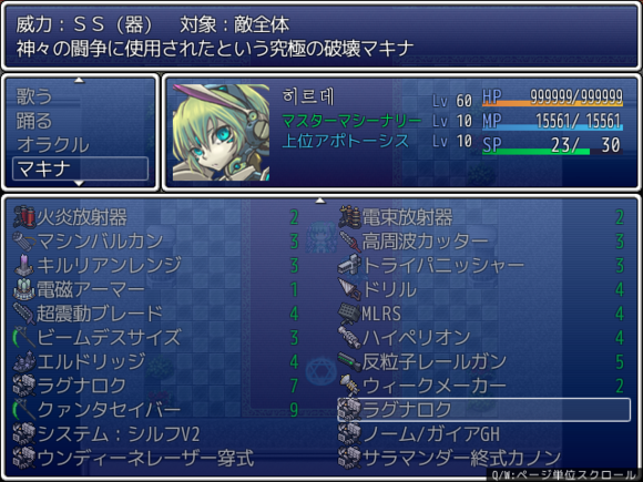 -> 스샷은 미궁 강보스 '마왕 학살자'와 '월드 브레이커'가 쓰는 기술들을 모조리 뺏어왔을 때의 모습. 퀀터 세이버 아래에 보이는 기술들은 4정령과 마키나가 연동된 혼돈계 스킬 4개 ( 가이아:노움GH(테라) / 운디네 레이저 천공식(양자) / 시스템 : 실프V2(하드론) / 샐러맨더 종식 캐논(핵열) )와 '라그나로크(핵열)(적 보스가 쓰는 건 마키나 없어도 쓸 수 있음)' 를 볼 수 있는데 아마 종장에서 배울 수 있을듯? 물론 이건 에디터를 통해 구현한거고, 정상적인 겜에선 배울 수 없다.